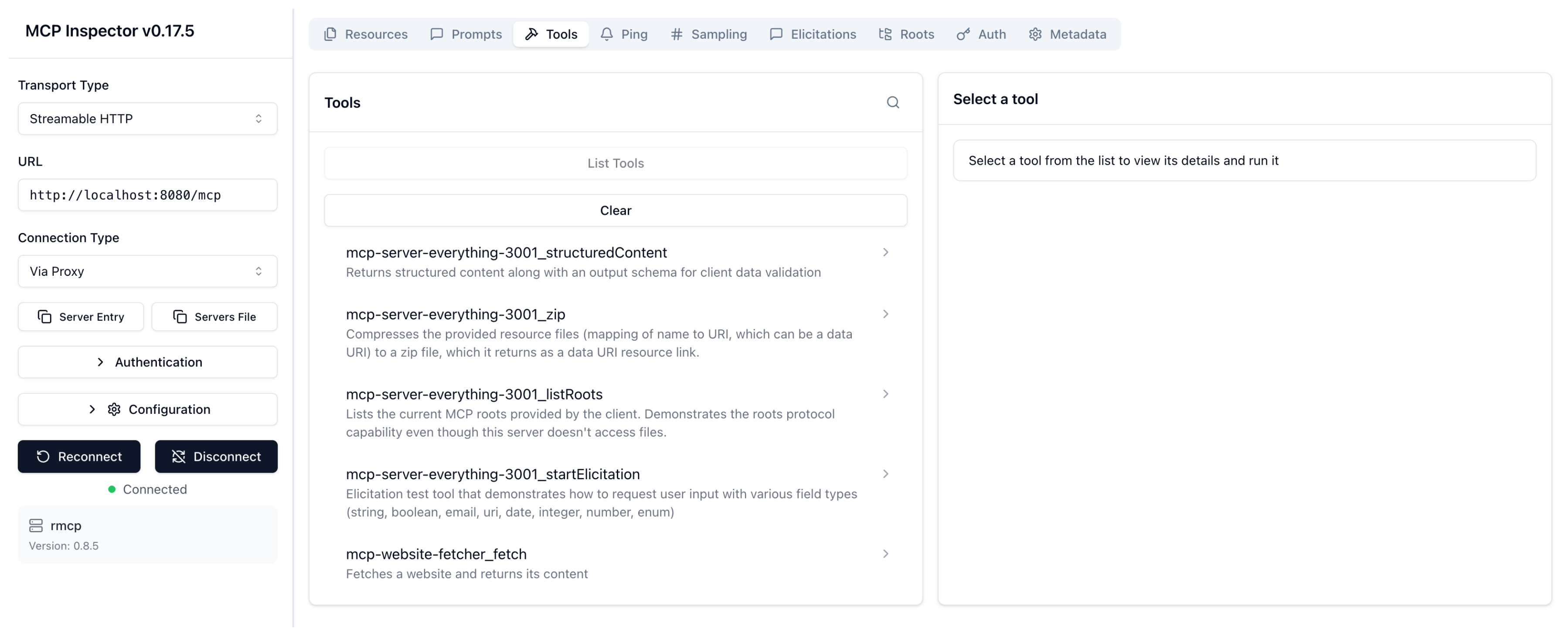 mcp-server-everything-3001_echotool: Click List Tools and select theechotool. In the message field, enter any string, such asHello world, and click Run Tool. Verify that your string is echoed back. - Test the